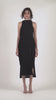 A mock neck dress featuring a side slit at the knee. Pleated with a 1cm wave pleat design. An elegant piece that can be layered with other items or worn on its own.
