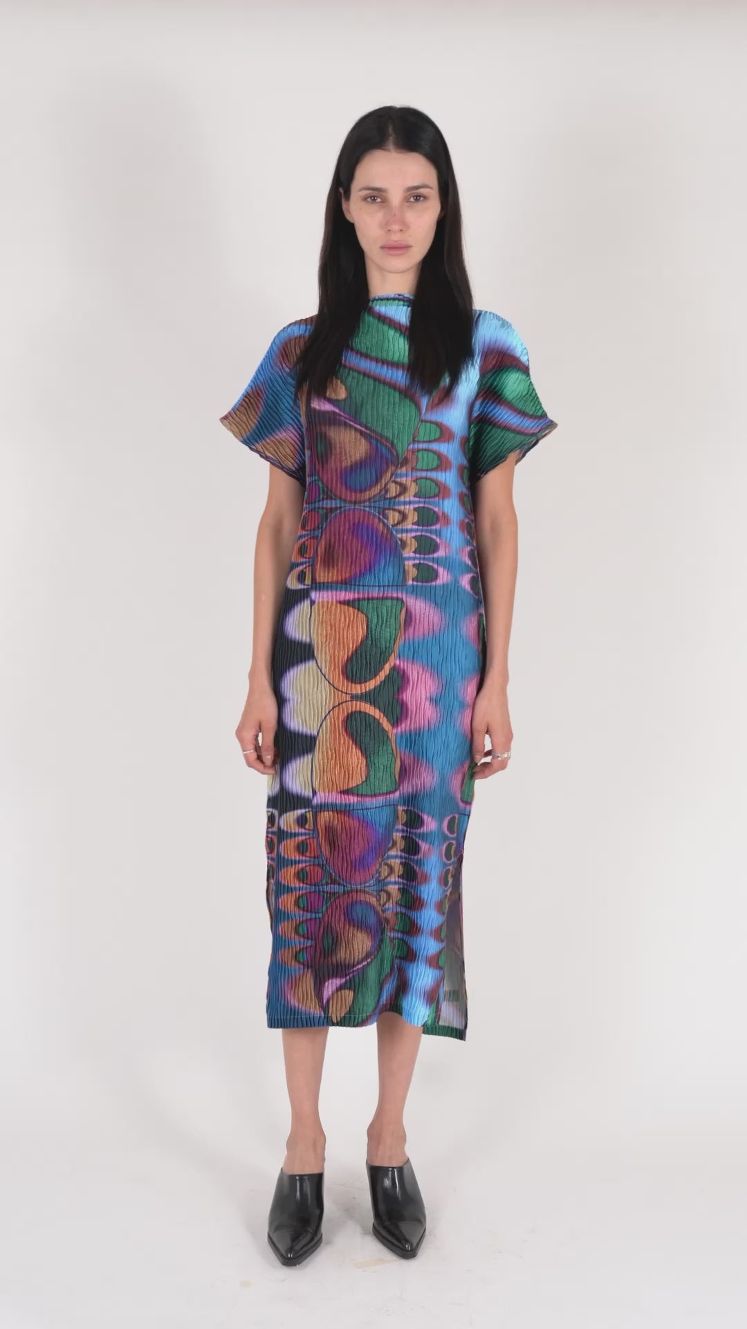 A Nin classic, this mid sleeve wave pleat dress is made for all, featuring a side slit opening, a variety of unique prints, and an open neck line. Unisex and versatile, this pleat midi dress is a must-have